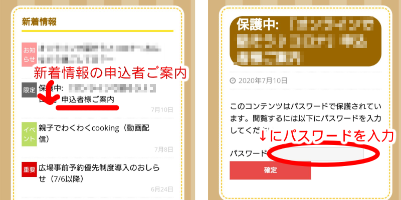 2)申込時にパスワードをお伝えしますので、『こちら』か、新着情報の『申込者様ご案内 』を選んでパスワード入力欄に入力