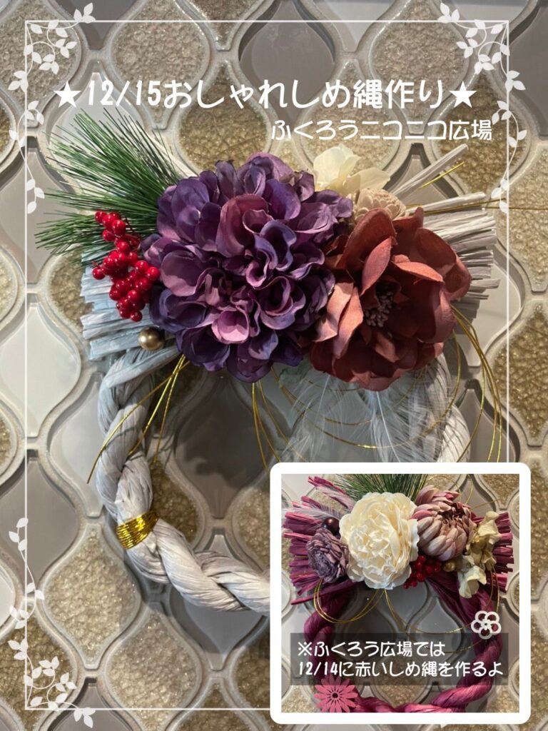 [12/15]おしゃれしめ縄作り 2022年11月8日 fukurou イベント 0 12月15日(木) ①10:30~ ②13:00~(製作時間60分強) 各回先着3組 参加費500円 ※事前申込が必要です おしゃれなしめ縄飾りでお正月を華やかに飾ってみませんか?ステキにアレンジしてオリジナルのしめ縄飾りを作りましょう♪