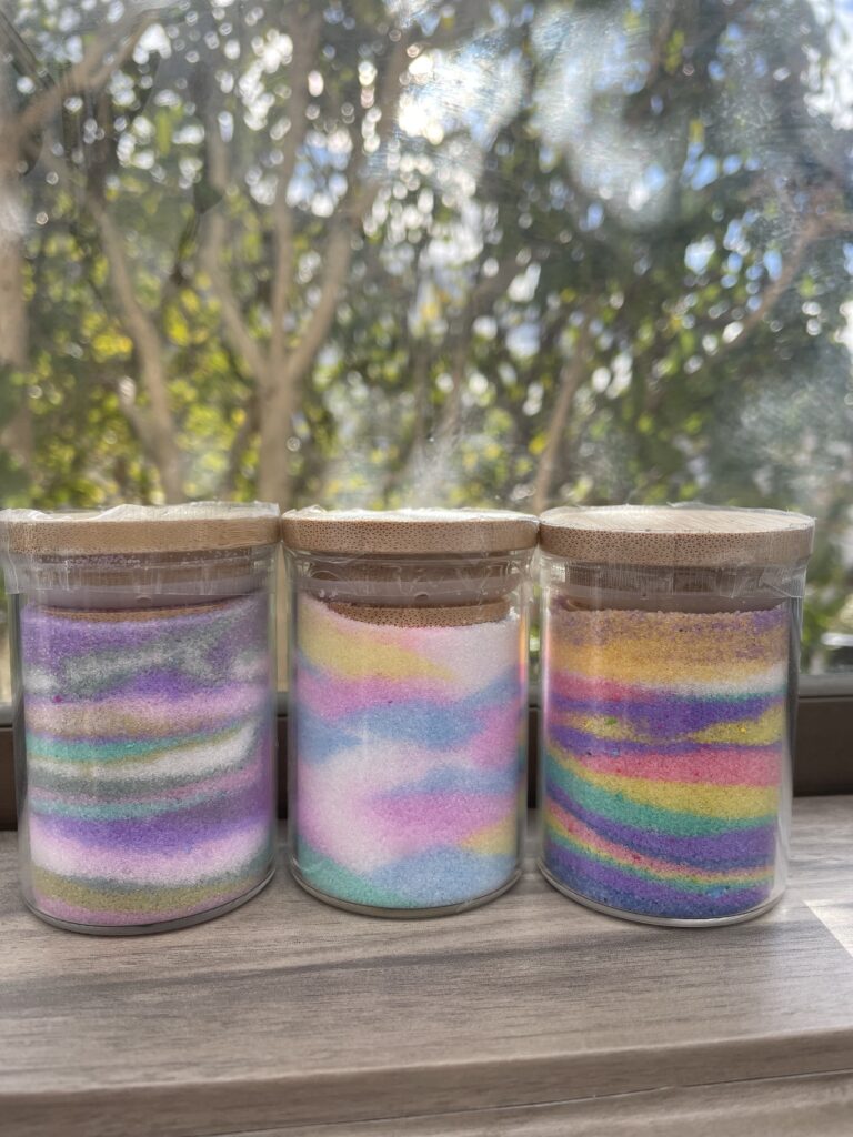 食塩にパステルでカラフルに色付けして小瓶に詰めるソルトボトルアート